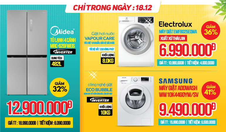 Hãy sẵn sàng đón DEAL DAY của ngày hôm nay 18/12: Máy giặt Samsung Addwash 10Kg lồng ngang WW10K44G0YW/SV giảm 41% giá deal day 9,490,000đ (GNY 15,990,000đ); Máy giặt Electrolux 8Kg lồng ngang EWF8025EQWA giảm 36% giá deal day 6,990,000đ (GNY 10,990,000đ); Tủ lạnh Midea SBS 482L MRC-626FWEIS giảm 32% giá deal day 12,900,000đ (GNY 18,990,000đ) Mỗi khách hàng chỉ được mua một sản phẩm.
