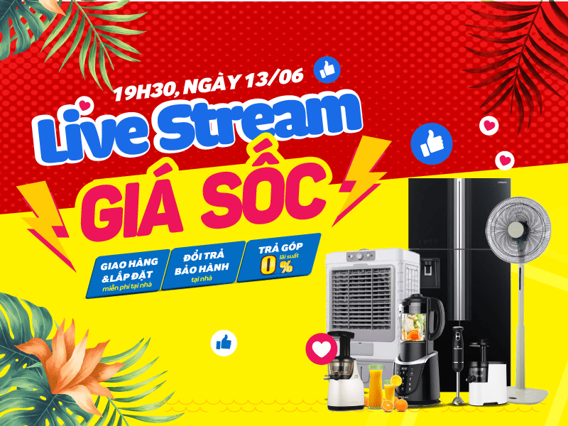 Trong buổi phát sóng hôm nay lúc 19h30, ngày 13/06 quý khách hàng sẽ được mua các sản phẩm quạt cây, máy ép trái cây, quạt điều hòa, tủ lạnh….với mức giảm giá lên tới 40% cùng nhiều phần quà hấp dẫn khác có trong livestream.