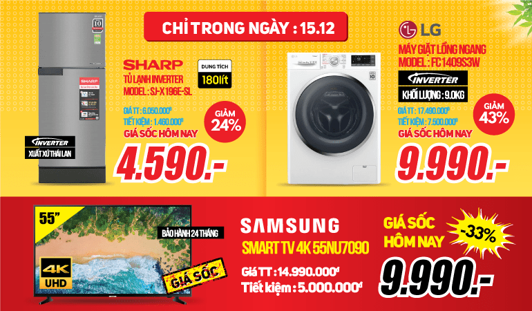 Hãy sẵn sàng đón DEAL DAY của ngày hôm nay 15/12: Tủ lạnh Sharp Inverter 180L SJ-X196E-SL giảm 24% giá deal day 4,590,000đ (GNY 6,050,000đ); Máy giặt lồng ngang Samsung Inverter 10Kg WW10K44G0UX/SV giảm 39% giá deal day 10,290,000đ (GNY 16,890,000đ); Máy giặt lồng ngang thông minh LG AI DD 9kg FV1409S3W giảm 43% giá deal day 9,990,000đ (GNY 17,490,000đ); TV LED SMART 4K UltraHDR 55" SAMSUNG UA55NU7090KXXV giảm 33% giá deal day 9,990,000đ (GNY 14,990,000đ). Mỗi khách hàng chỉ được mua một sản phẩm.