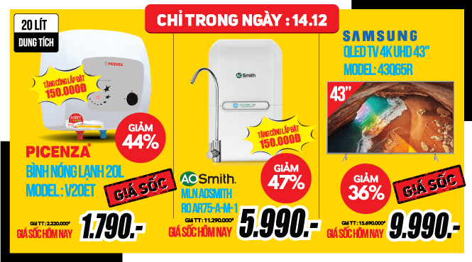Hãy sẵn sàng đón DEAL DAY của ngày hôm nay 14/12: Bình nóng lạnh gián tiếp Picenza 20L V20ET giảm 44% giá deal day 1,790,000đ (GNY 3,220,000đ), tặng kèm công lắp đặt 150.000đ; Máy lọc nước AOSmith RO AR75-A-M-1 giảm 47% giá deal day 5,990,000đ (GNY 11,280,000đ); Bếp từ cơ Midea MI-B2015DE (kèm lẩu) giảm 43% giá deal day 599,000đ (GNY 1,060,000đ); TV QLED SMART 4K UltraHDR 43" SAMSUNG QA43Q65RAKXXV giảm 36% giá deal day 9,990,000đ (GNY 15,690,000đ). Mỗi khách hàng chỉ được mua một sản phẩm.