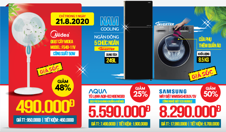 Hãy sẵn sàng đón DEAL HOT của ngày hôm nay 21/08: Nồi cơm điện cơ 2L Cuckoo CR-1122 - Korean giá chỉ còn 1,299,000đ; Quạt cây Midea FS40-11V giảm 48% giá chỉ 490,000 (giá niêm yết 950,000)đ; Tủ lạnh Aqua 249L AQR-IG248EN(GB) giảm 25% giá cực sốc chỉ 5,590,000đ (giá niêm yết 7,490,000); Điều hòa Samsung 1C Inverter 9400BTU AR10TYHYCWKNSV giá chỉ 6,790,000đ trong hôm nay. Máy giặt Samsung AddWash 8.5KG lồng ngang WW85K54E0UX/SV giảm 50% giá sốc 8,290,000đ (giá niêm yết 17,990,000đ). Mỗi khách hàng chỉ được mua 01 sản phẩm!