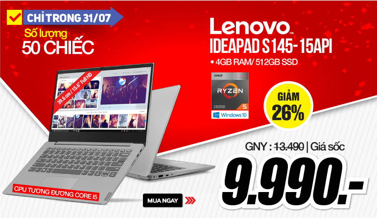 Hãy sẵn sàng đón DEAL HOT của ngày hôm nay 31/07: Laptop Lenovo IdeaPad S145-15API 81UT00F1VN Den W10 /Ryzen 5-3500U /4GB /512GB /15.6FHD giảm 26% giá khuyễn mãi 9,990,000đ (giá gốc 13,490,000). Điện thoại Samsung Galaxy M21 SM-M215F 64GB Blue giảm 33% giá khuyễn mãi 3,990,000 (giá gốc 5,990,000đ). Mức giá sốc này sẽ chỉ áp dụng duy nhất 01 ngày, mỗi khách hàng chỉ được mua 01 sản phẩm!