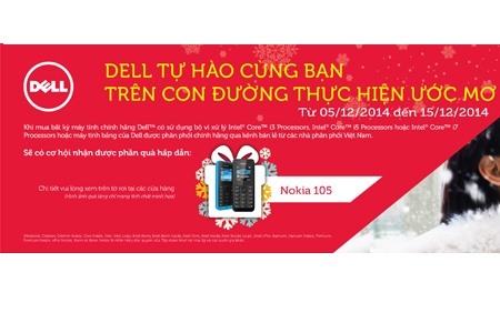 Bước vào Mùa Giáng sinh, Media Mart cùng với hãng máy tính hàng đầu thế giới DELL gửi đến Quý khách hàng chương trình ưu đãi hấp dẫn "Dell tự hào cùng bạn trên con đường thực hiện ước mơ". Theo đó từ 05/12 – 15/12/2014, khi mua bất kỳ máy tính chính hãng Dell™ từ các Siêu thị điện máy Media Mart có sử dụng bộ vi xử lý Intel Core i3, Core i5, Core i7 hoặc máy tính bảng Dell được sở hữu ngay 01 điện thoại Nokia N105 thời trang.