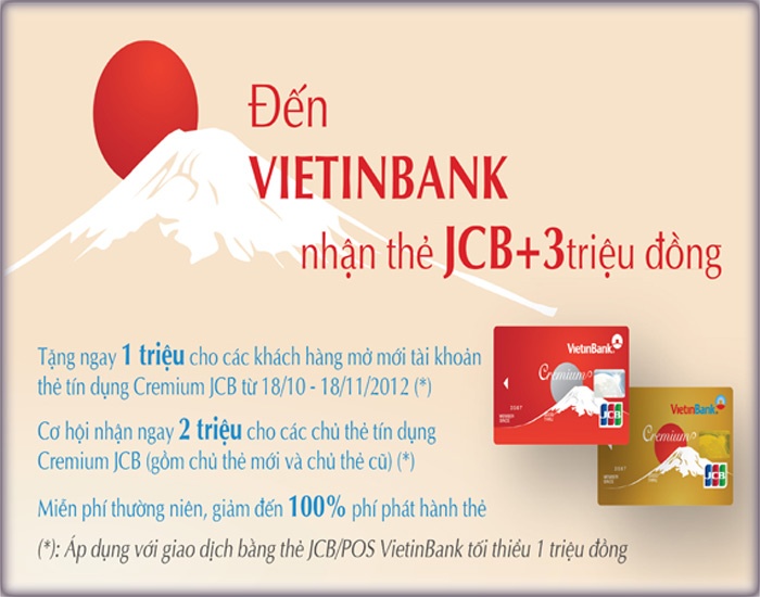 o Tặng ngay 1 triệu đồng, cho chủ thẻ hợp lệ phát sinh giao dịch chi tiêu đầu tiên của thẻ VietinBank - JCB từ 1 triệu đồng trở lên trong thời gian khuyến mãi. Chỉ áp dụng cho các thẻ phát hành từ 18/10 đến 18/11/2012 và thực hiện chi tiêu lần đầu trong thời gian này.