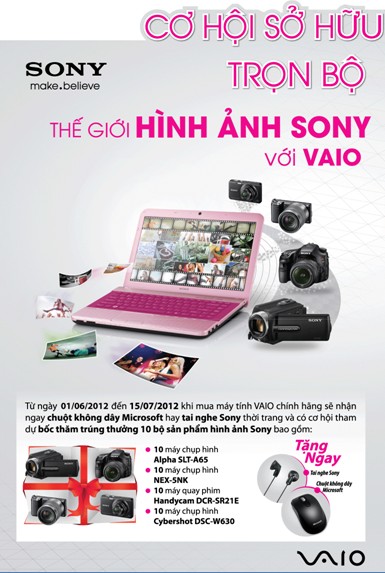 Theo đó từ 1/6-15/7 khi mua laptop Sony Vaio chính hãng tại các siêu thị thuộc hệ thống Thế giới điện máy Media Mart khách hàng sẽ nhận ngay chuột không dây Microsoft hoặc tai nghe Sony đồng thời được tham gia vào chương trình bốc thăm trúng thưởng 10 bộ sản phẩm hình ảnh Sony.