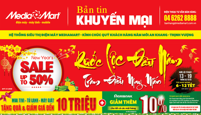 Theo đó, mua sắm những ngày đầu xuân Bính Thân 2016, các khách hàng của MediaMart được tặng quà và giảm giá lên đến 10 triệu đồng. Với mức ưu đãi ‘khủng”, đây là thời điểm mua sắm các sản phẩm Tivi, smartphone, laptop… với giá rẻ chưa từng có.