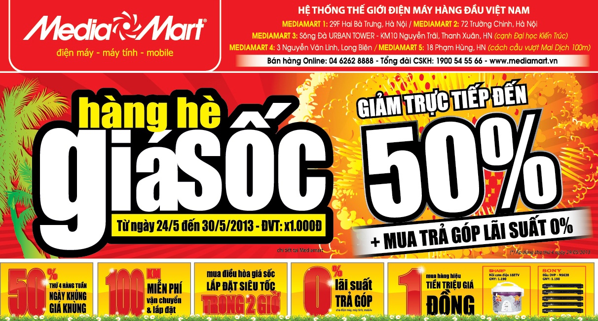 Chuỗi hoạt động khuyến mại Hàng hè giá sốc đang được triển khai tại Media Mart được hầu hết khách hàng đánh giá là đa dạng, thiết thực, ý nghĩa trong thời kỳ cao điểm nắng nóng và là chương trình có quy mô lớn nhất trên thị trường điện máy – máy tính – mobile trong mùa hè 2013.