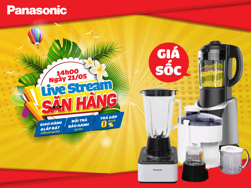 Trong buổi phát sóng vào14h00 Thứ 5 hôm nay, ngày 21/05, khách hàng tham gia Livestream sẽ được mua sắm các sản phẩm MÁY ÉP TRÁI CÂY, MÁY XAY SINH TỐ, MÁY LÀM SỮA HẠT… đến từ nhiều thương hiệu nổi tiếng, trong đó PANASONIC là một cái tên quen thuộc, với giá SỐC giảm đến 40% so với giá niêm yết.
