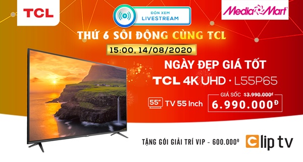 Trong Livestream: Smart TV TCL 4K UHD 55 inch L55P65 sẽ được bán với mức giá vô cùng sốc - Giảm 50%, Giá Livestream chỉ 6.990.000đ (giá niêm yết 13.990.000đ). Tặng kèm gói giải trí vip Clip TV trị giá đến 600.000đ