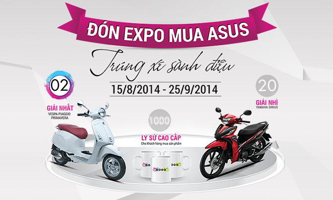 "Asus Expo 2014" là sự kiện lớn thường niên của Asus tại Việt Nam và Media Mart phối hợp thực hiện chương trình khuyến mại “Đón Expo Mua Asus - Trúng xe sành điệu", theo đó những khách hàng mua các sản phẩm công nghệ Laptop Asus, Máy tính bảng Asus, Smartphone Asus, AIO… từ ngày 15/08/2014 đến ngày 25/09/2014 sẽ có cơ hội nhận các Giải thưởng cực lớn như 2 giải nhất, mỗi giải 1 xe Piaggio Vespa Primavera, 20 giải nhì, mỗi giải 1 xe Yamaha Sirius và quà tặng 1000 chiếc ly cao cấp.