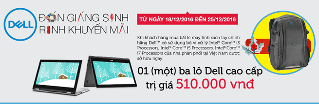 Từ 18/12- 25/12/2016, Mediamart & Dell thực hiện CTKM “Đón Giáng Sinh, Rinh Khuyến Mãi“. Theo đó khi mua máy tính xách tay chính hãng Dell™ có sử dụng bộ vi xử lý Intel Core i3, i5, i7 tại Mediamart, khách hàng sẽ được tặng 01 (một) balo Dell cao cấp trị giá 510.000đ.