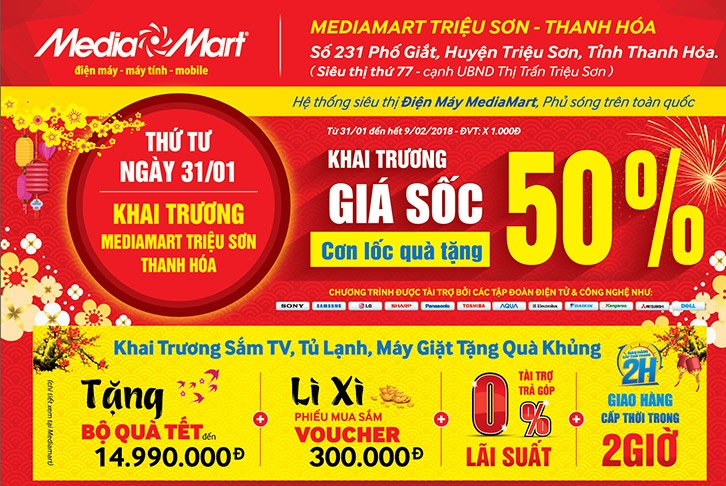 Thứ tư, ngày 31/1/2018, MediaMart sẽ đồng loạt khai trương thêm 2 siêu thị mới, cùng chào đón thành viên thứ 77 - MEDIAMART TRIỆU SƠN (Số 231 Phố Giắt, Huyện Triệu Sơn, Tỉnh Thanh Hóa (cạnh UBND Thị Trấn Triệu Sơn)) và thành viên thứ 78 - MEDIAMART NGÔ QUYỀN ( 66 Ngô Quyền, P.Vĩnh Trại, TP. Lạng Sơn, Tỉnh Lạng Sơn). Tiếp theo đó, thứ 6, ngày 02/2/2018, thành viên thứ 79 sẽ được ra mắt là MEDIAMART XUÂN MAI ( Ngã tư thị trấn Xuân Mai, Huyện Chương Mỹ, Hà Nội).