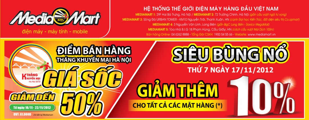 Tiếp tục dành ngân sách hàng tỷ đồng cho đợt 3 Tháng khuyến mại Hà Nội 2012, Media Mart tặng ngay 10,000 nồi cơm điện, máy làm sữa đậu nành, đầu phát HD cao cấp và 10,000 lò vi sóng Sanyo; giảm giá liên hoàn 30% + 10% lại tặng thêm phần quà 10 triệu đồng cho hầu hết các mặt hàng, Tivi càng to giá càng rẻ… Đợt giảm giá lớn nhất trong năm này chính thức diễn ra từ 16/11 đến hết 22/11