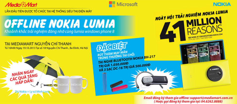 MediaMart vinh dự kết hợp với Nokia Việt Nam tổ chức chương trình này nhằm mang tới các khách hàng của mình các thông tin bổ ích và cảm nhận khi trải nghiệm thực tế các sản phẩm mới nhất. Tính đến 16/10 đã có rất nhiều khách hàng đã đăng ký tham gia chương trình "Offline Nokia Lumia tại Media Mart ngày 19/10 - Nhận ngay quà sành điệu"