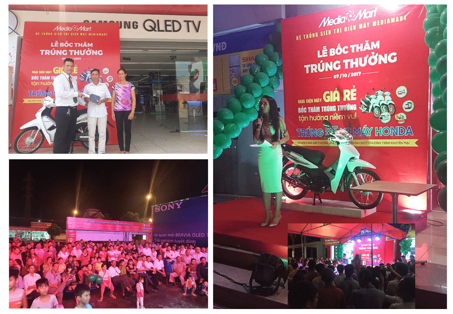 Vào 19h00 thứ bảy, ngày 7/10/2017 vừa qua, Công ty Cổ phần MediaMart Việt Nam và các chi nhánh công ty Cổ phần MediaMart Việt Namv đã tổ chức Lễ bốc thăm trúng thưởng trong chương trình "Mua Điện máy Bốc thăm trúng thưởng - Tận hưởng niềm vui" diễn ra từ 22/7 - 30/9/2017. Lễ bốc thăm được tổ chức công khai và đã xác định được hơn 2400 khách hàng trúng giải 55 xe máy Honda cùng hàng ngàn giải thưởng lò vi sóng, nồi cơm điện, bình siêu tốc cao cấp.