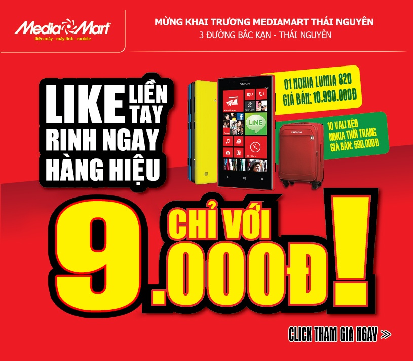 Nằm trong chuỗi sự kiện chào mừng khai trương siêu thị thứ 9 trong Hệ thống thế giới điện máy Media Mart, cuộc thi "Like liền tay - rinh ngay dế khủng chỉ với 9000 đồng" được tổ chức trên fanpage http://www.facebook.com/DienmayMediaMart đã diễn ra vô cùng sôi động và hào hứng với sự tham gia của hơn 600 người chơi.