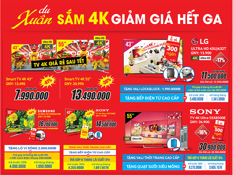 Tại MediaMart, trong dịp mua sắm đầu năm mới, loạt tivi 4K giảm giá cực rẻ không thể bỏ qua đến từ các thương hiệu Samsung, LG, Sony, với công nghệ màn hình tiên tiến, chất lượng hình ảnh vượt trội, mang đến cho bạn những trải nghiệm tuyệt vời : Smart Tivi 4K UHD 43inch giảm 41% giá cực sốc 7.990.000đ; Smart Tivi 4K UHD 55inch giảm 36% giá khuyến mại 13.490.000đ; Smart Tivi 4K UHD 43inch LG 43UJ632T giá khuyến mại 11.500.000đ, tặng vali Lock&Lock, bếp từ cao cấp; Smart Tivi 4K UHD 50inch Samsung 50MU6100 giá khuyến mại 16.200.000đ tặng lò vi sóng trị giá 2 triệu đồng; Smart Tivi 4K UHD 55inch Sony 55X8500E giá khuyến mại 30.900.000đ tặng vali thời trang cao cấp, quạt sưởi siêu mỏng…