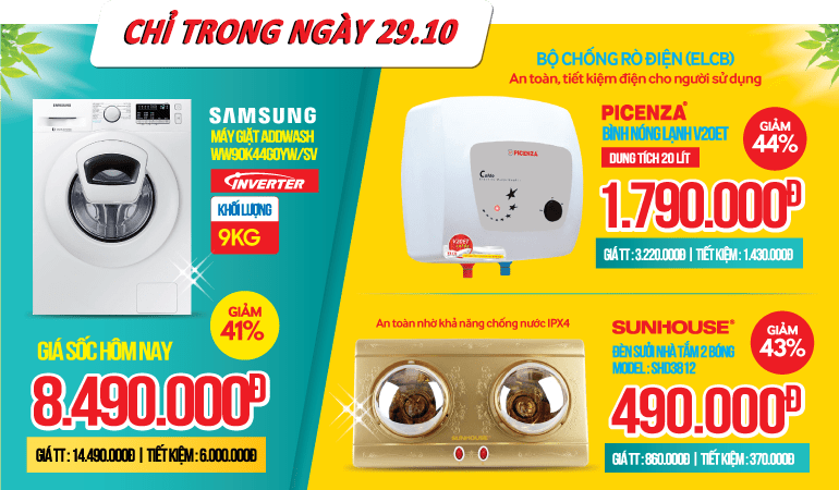 Hãy sẵn sàng đón FLASH SALE của ngày hôm nay 29/10: Đèn sưởi 2 bóng Sunhouse SHD3812 giảm 43% giá chỉ từ 490,000đ; Bình nóng lạnh gián tiếp Picenza 20L V20ET giảm 44% giá khuyễn mại 1,790,000đ; Máy giặt Samsung Addwash 9Kg lồng ngang WW90K44G0YW/SV giảm 41% giá hôm nay 8,490,000đ Mỗi khách hàng chỉ được mua một sản phẩm.