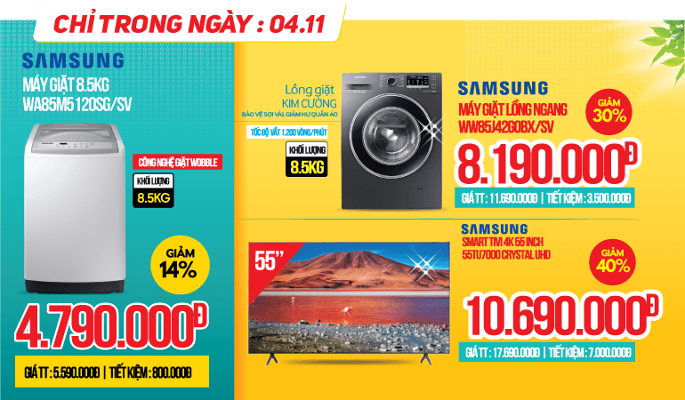 Hãy sẵn sàng đón FLASH SALE của ngày hôm nay 04/11: Máy giặt Samsung lồng đứng 8,5KG WA85M5120SG/SV giảm 14% giá chỉ còn 4,790,000đ; Máy giặt lồng ngang Samsung Inverter 8,5Kg WW85J42G0BX/SV giảm 30% giá chỉ 8,190,000đ; Smart Tivi 4K Samsung 55 inch 55TU7000 Crystal UHD giảm 40% giá ưu đãi 10,690,000đ. Mỗi khách hàng chỉ được mua một sản phẩm.