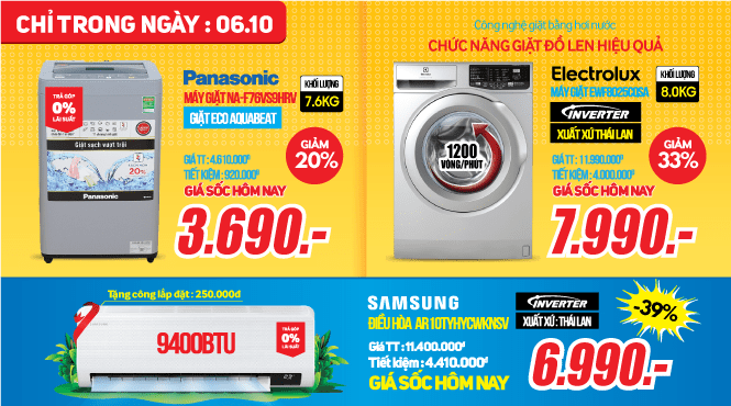 Hãy sẵn sàng đón FLASH SALE của ngày hôm nay 06/10: Máy giặt Electrolux 8Kg lồng ngang EWF8025CQSA giảm 33% giá chỉ 7,990,000đ; Máy giặt Panasonic lồng đứng 7,6kg NA-F76VS9HRV giảm 20% giá ưu đãi 3,690,000đ; Điều hòa Samsung 1C Inverter 9400BTU AR10TYHYCWKNSV giảm 39% giá chỉ 6,990,000đ, Tặng công lắp đặt tri giá 250.000đ. Mỗi khách hàng chỉ được mua 01 sản phẩm!