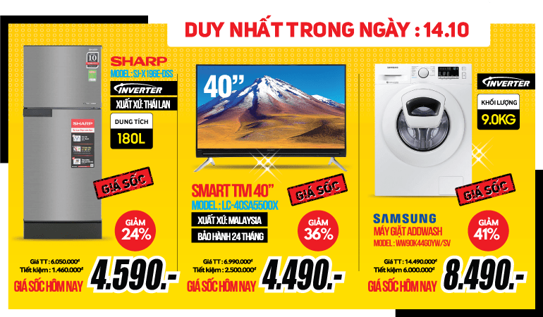 Hãy sẵn sàng đón FLASH SALE của ngày hôm nay 14/10: Máy giặt Samsung Addwash 9Kg lồng ngang WW90K44G0YW/SV giảm 41% giá chỉ 8,490,000đ; Tủ lạnh Sharp Inverter 180L SJ-X196E-DSS giảm 24% giá khuyến mãi 4,590,000đ; Smart Tivi 40 inch LC-40SA5500X giảm 36% giá chỉ còn 4,490,000đ. Mỗi khách hàng chỉ được mua 01 sản phẩm!