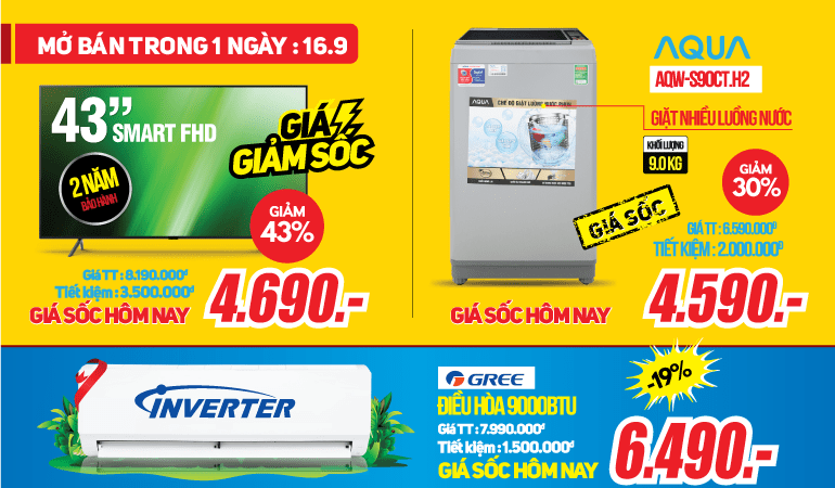 Hãy sẵn sàng đón FLASH SALE của ngày hôm nay 16/09: Điều hòa Gree 1C inver 9000BTU GWC09CA-K3DNC2I TQ giảm 19% giá còn 6,490,000đ,Tặng công lắp đặt tri giá 250.000đ; Máy giặt AQUA 9KG AQW-S90CT.H2 giảm 30% giá khuyến mãi 4,590,000đ; Tivi LED Smart FHD 43 inch giảm tới 43% giá chỉ từ 4,690,000đ. Mỗi khách hàng chỉ được mua 01 sản phẩm!