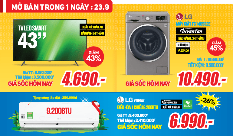 Hãy sẵn sàng đón FLASH SALE của ngày hôm nay 23/09: Máy giặt LG Inverter 9Kg lồng ngang FC1409S2E giảm 45% giá còn 10,490,000đ; Điều hòa LG 1C inver 9.200BTU V10ENW giảm 26% giá khuyến mãi 6,990,000đ, Tặng công lắp đặt tri giá 250.000đ; Smart tivi Led 43 inch giảm 43% 4,690,000đ. Mỗi khách hàng chỉ được mua 01 sản phẩm!