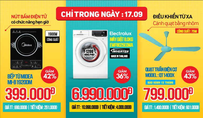 Hãy sẵn sàng đón FLASH SALE của ngày hôm nay 17/09: Bếp từ Midea MI-B1920DM giảm tới 42% giá chỉ 399,000đ; Máy giặt Electrolux 8Kg lồng ngang EWF8025EQWA giảm 36% giá khuyến mãi 6,990,000đ; Quạt trần Điện cơ QT1400X - Có điều khiển - Cánh nhôm giảm 43% giá chỉ còn 799,000đ. Mỗi khách hàng chỉ được mua 01 sản phẩm!