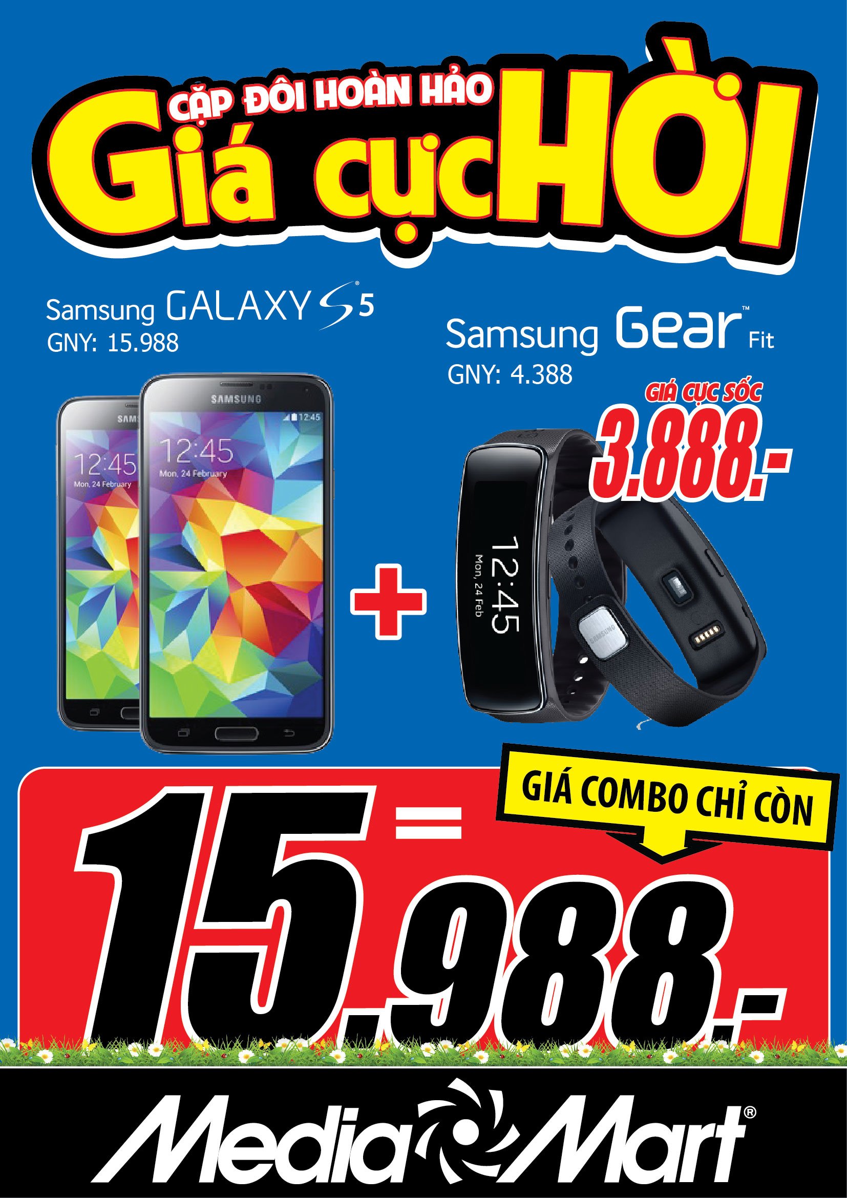Samsung Galaxy S5 là chiếc smartphone cao cấp đáng sở hữu nhất hiện nay trên thị trường, máy trang bị khá nhiều tính năng cao cấp như: tính năng đo nhịp tim và theo dõi sức khỏe; camera 16MP cho phép chụp ảnh nhanh hơn, lấy nét trong vòng 0.3 giây và hỗ trợ HDR; công nghệ chống nước và chống bụi IP6 và một tính năng thú vị khác là đồng bộ với chiếc đồng hồ thông minh Gear Fit. Giá bán của riêng siêu phẩm Galaxy S5 hiện nay trên thị trường đang là 15.988.000 đồng. Nhưng tại MediaMart, khách hàng có thể mua bộ đôi này smartphone và đồng hồ thông minh này với giá combo chỉ 15.988.000 đồng.