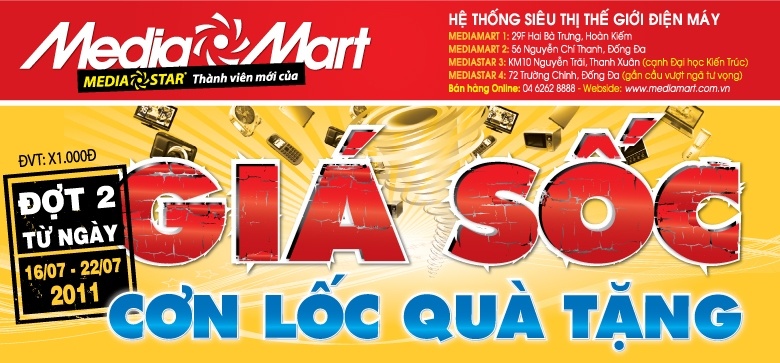 Cơ hội mua hàng giá rẻ với hàng ngàn quà tặng giá trị sẽ diễn ra tại 04 đại siêu thị: Media Mart 1 (29F Hai Bà Trưng, Hoàn Kiếm), Media Mart 2 (56 Nguyễn Chí Thanh), Media Star 3 (Km 10 Nguyễn Trãi, Thanh Xuân) và Media Star 4 (72 Trường Chinh).