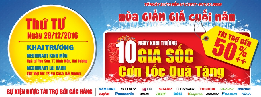 Theo đó, ngày 28/12, MediaMart Kinh Môn sẽ chính thức khai trương. Tiếp đến ngày 31/12, MediaMart Lai Cách tiếp tục được đưa vào vận hành. Để chào mừng sự kiện đặc biệt này, Media Mart mang đến “ 10 ngày Giá sốc cơn lốc quà tặng”.