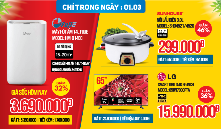 Hãy sẵn sàng chào đón chương trình GIÁ SỐC ONLINE của ngày hôm nay 01/03: Máy hút ẩm 14L FujiE HM-914EC giảm 32% giá sốc 3,690,000đ (5,390,000đ); Nồi lẩu điện Sunhouse SHD4521/4520 giảm 46% giá sốc 299,000đ (GNY 550,000đ); Điều hòa Midea 1C 9.000BTU MSMA3-10CRN1 giảm 36% giá còn 4,490,000đ (GNY 6,990,000đ); Smart Tivi LG 4K UHD 65 inch 65UN7000PTA giảm 36% giá sốc 15,990,000đ (24,900,000đ).