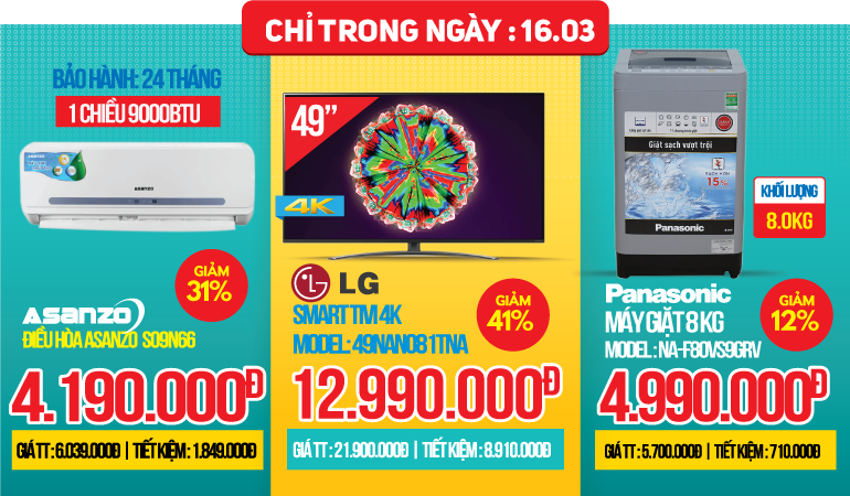 Hãy sẵn sàng chào đón chương trình GIÁ SỐC ONLINE của ngày hôm nay 16/03: Điều hòa Asanzo 1 chiều 9000BTU S09N66 giảm 31% giá sốc 4,190,00đ (GNY 6,039,000đ); Máy giặt 8 Kg Panasonic NA-F80VS9GRV giảm 12% giá sốc 4,990,00đ (GNY 5,700,000đ); Điều hòa Casper 1 chiều 9000BTU SC-09TL32 giảm 13% giá sốc 5,990,00đ (6,900,000đ); Smart Tivi 4K LG 49 inch 49NANO81TNA giảm 41% giá sốc 12,990,00đ (GNY 21,900,000đ).