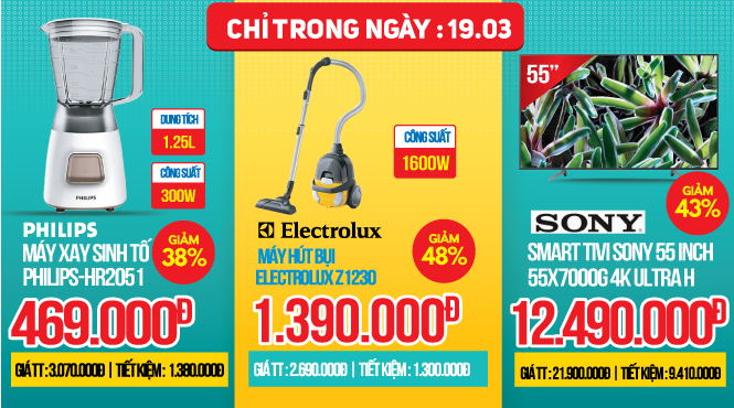 Hãy sẵn sàng chào đón chương trình GIÁ SỐC ONLINE của ngày hôm nay 19/03: Smart Tivi Sony 55 inch 55X7000G 4K Ultra HD giảm 43% giá sốc 12,490,000đ (GNY 21,900,000đ); Máy hút bụi Electrolux Z1230 giảm 48% giá sốc 1,390,000đ (GNY 2,690,000đ); Máy xay sinh tố Philips-HR2051 giảm 38% giá sốc 469,000đ (GNY 760,000đ); Quạt cây Điện cơ QD450-DM giảm 39% giá sốc 369,000đ (GNY 600,000đ).