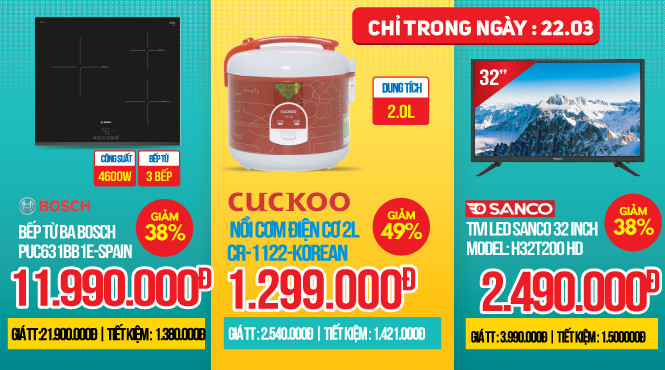 Hãy sẵn sàng chào đón chương trình GIÁ SỐC ONLINE của ngày hôm nay 22/03: Bếp từ ba Bosch PUC631BB1E-Spain giảm 45% giá sốc 11,990,000đ (GNY 21,900,000đ); Nồi cơm điện cơ 2L Cuckoo CR-1122-Korean giảm 49% giá sốc 1,299,000đ (GNY 2,540,000đ); Bếp gas dương kính Kangaroo KG506/KG503 giảm 43% giá sốc 699,000đ (GNY 1,230,000đ); Tivi LED Sanco 32 inch H32T200 HD giảm 32% giá sốc 2,490,000đ (GNY 3,990,000đ).