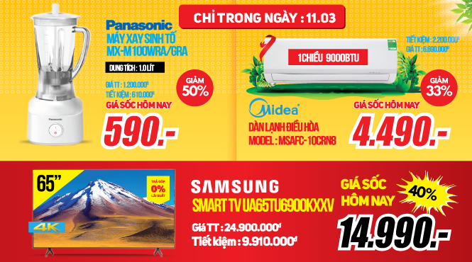Hãy sẵn sàng chào đón chương trình GIÁ SỐC ONLINE của ngày hôm nay 11/03: Máy xay sinh tố Panasonic MX-M100WRA/GRA giảm 50% giá sốc 590,000đ (GNY 1,200,000đ); LVS cơ có nướng 20L Sharp R-G228VN-SL giảm 25% giá sốc 1,490,000đ (GNY 1,990,000đ); Điều hòa Midea 1C 9000BTU MSAFC-10CRN8 giảm 33% giá sốc 4,490,000đ (GNY 6,690,000đ), Trả góp lãi suất 0% + 1 đổi 1 trong 12 tháng; Smart Tivi Samsung 4K 65 inch 65TU6900 UHD giảm 40% giá sốc 14,990,000đ (GNY 24,900,000đ).