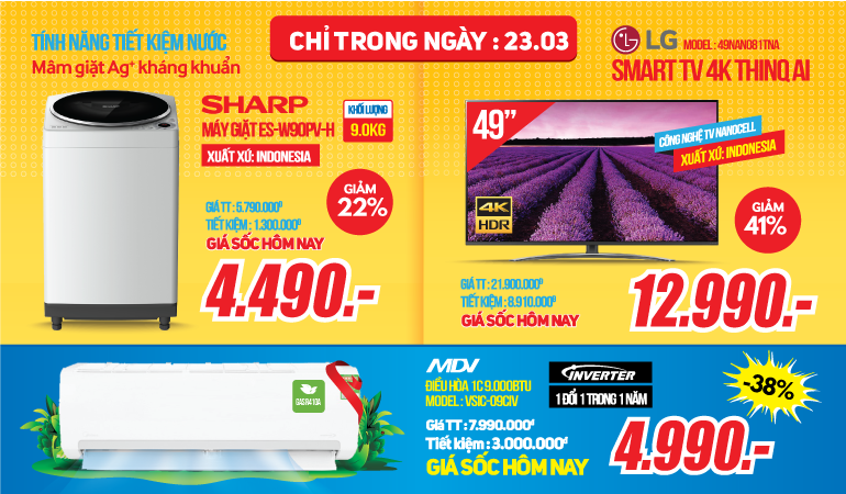 Hãy sẵn sàng chào đón chương trình GIÁ SỐC ONLINE của ngày hôm nay 23/03: Tủ lạnh Sharp 630L SJ-FX630V-ST giảm 36% giá sốc 15,900,000đ (GNY 24,900,000đ); Điều hòa MDV 1 chiều inverter 9.000BTU VSIC-09CIV giảm 38% giá sốc 4,990,000đ (GNY 7,990,000đ), tặng bảo hành 1 đổi 1 trong 1 năm; Máy giặt Sharp 9Kg ES-W90PV-H giảm sốc 4,490,000đ (GNY 5,790,000đ); Smart Tivi 4K LG 49 inch 49NANO81TNA giảm 41% giá sốc 12,990,000đ (GNY 21,900,000đ).