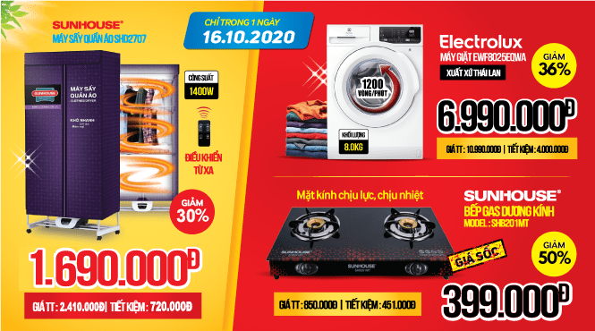 Hãy sẵn sàng đón FLASH SALE của ngày hôm nay 16/10: Bếp gas dương kính Sunhouse SHB201MT giảm 50% giá chỉ còn 399.000đ, Máy xay sinh tố Philips-HR2051 giảm 49% giá chỉ còn 499.000đ, Máy sấy quần áo Sunhouse SHD2707 giảm 30% giá chỉ còn 1.690.000đ, Máy giặt 8 Kg Electrolux EWF8025EQWA giảm 36% giá chỉ còn 6.990.000đ