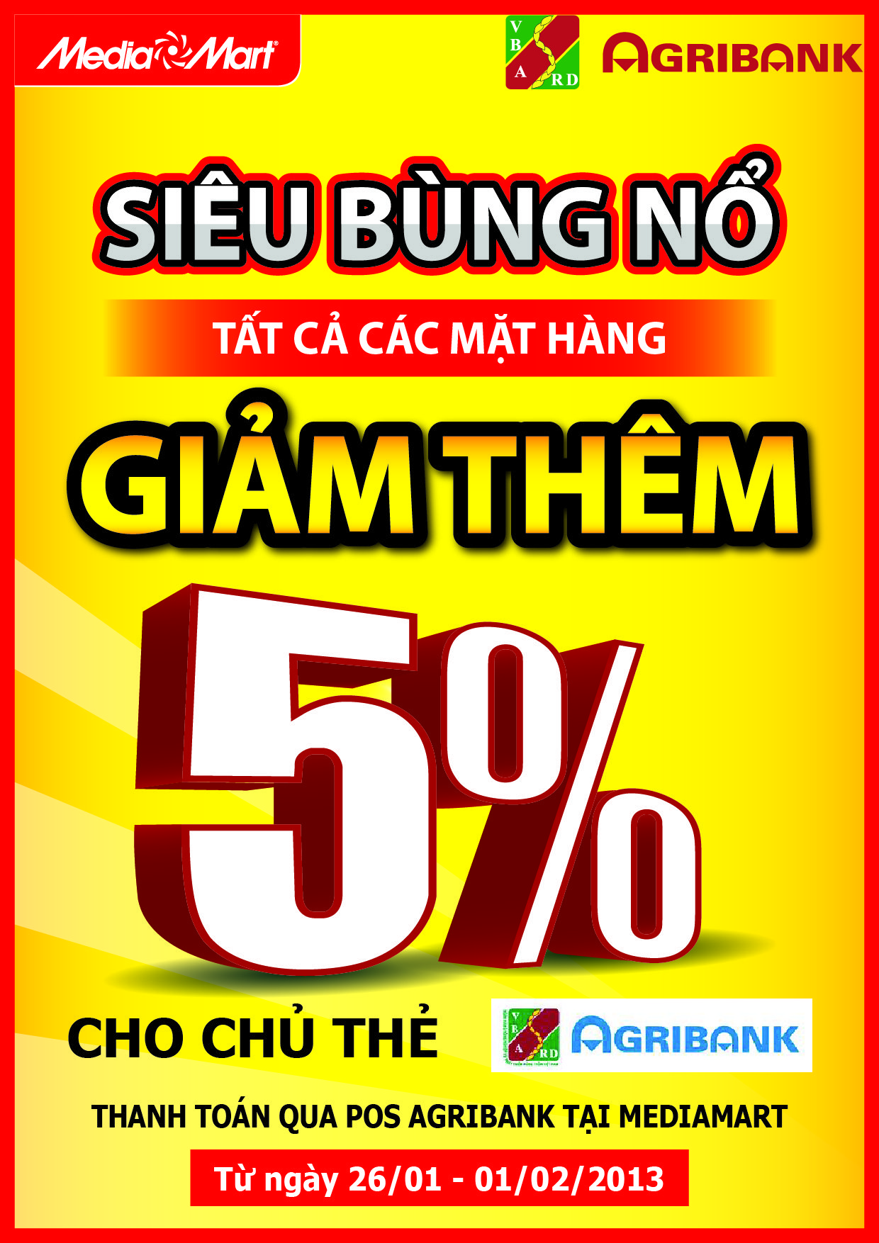 - Kết thúc đợt khuyến mại, Agribank Hanoi sẽ đối chiếu, tổng hợp số liệu và hạch toán ghi có vào tài khoản tiền gửi của chủ thẻ Agribank đã thanh toán tiền hàng hoá dịch vụ tại Media Mart trong 15 ngày đầu tháng 03/2013.