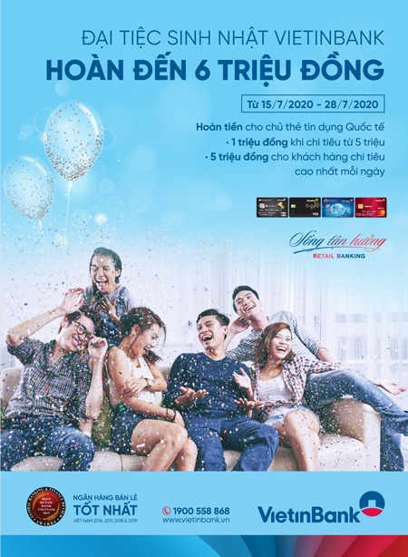Nhằm tri ân khách hàng nhân Kỷ niệm 32 năm Ngày Thành lập, VietinBank triển khai Chương trình khuyến mại (CTKM) “Sinh nhật rộn ràng - Tuần vàng ưu đãi” (Chương trình). Chương trình được triển khai từ ngày 15/7/2020 - 28/7/2020 với mức hoàn tiền lên đến 6.000.000 VND cho chủ thẻ Tín dụng Quốc tế (TDQT) VietinBank phát sinh chi tiêu tại các siêu thị điện máy MediaMart trên toàn quốc.