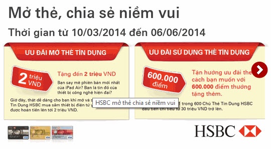 Theo đó, khách hàng đăng ký và phát hành thẻ tín dụng HSBC mới trong khoảng thời gian từ 10/3/2014 đến 6/6/2014 sẽ nhận được các Ưu đãi cực lớn như sau: