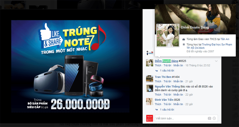 Chúc mừng chủ tài khoản Facebook Diễm Duyên Dáng  đã là người chơi may mắn nhất trúng bộ giải thưởng Note 7 trị giá 26 triệu đồng của chương trình "Like, Share & Trúng Note 7 chỉ trong một nốt nhạc" diễn ra từ 11/8 -  19/8/2016 trên Facebook Fanpage của Mediamart.