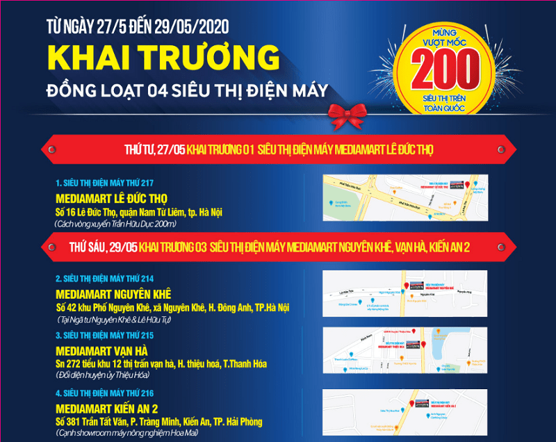Sáng thứ 4 ngày 27/05 và sáng thứ 6 ngày 29/05, MediaMart sẽ đồng loạt khai trương thêm 4 siêu thị điện máy mới tại Hà Nội, Hải Phòng và Thanh Hóa, nâng tổng số thành viên trên toàn hệ thống lên 217 siêu thị. Nhân dịp này, quý khách hàng tại các điểm khai trương có cơ hội đến với chuỗi Ngày vàng khuyến mại kéo dài từ ngày 27/5 - 5/6/2020.