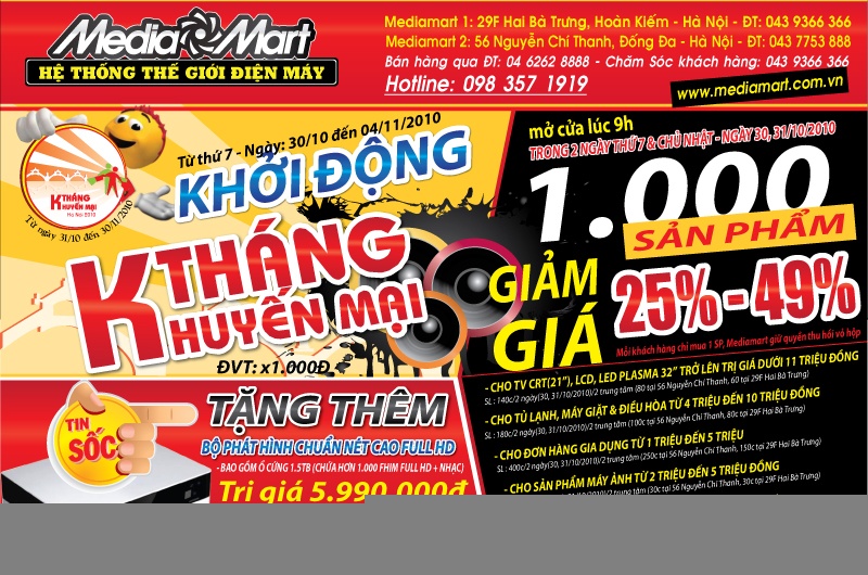 Với chương trình khuyến mại Khởi động tháng khuyến mại Đợt 1 diễn ta từ ngày 30/10 -4/11/2010. 1000 sản phẩm điện tử, điện lanh, đồ gia dụng, It &KTS được giảm giá cực sốc lên đến 49%. Ngoài ra một số sản phẩm tiêu biểu như :