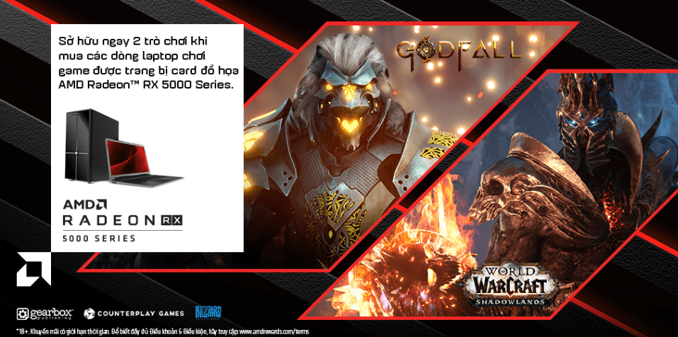 • Tặng 2 game Godfall và World of Warcraft: Shadowlands khi sở hữu laptop có sử dụng card đồ họa AMD Radeon RX 5600M