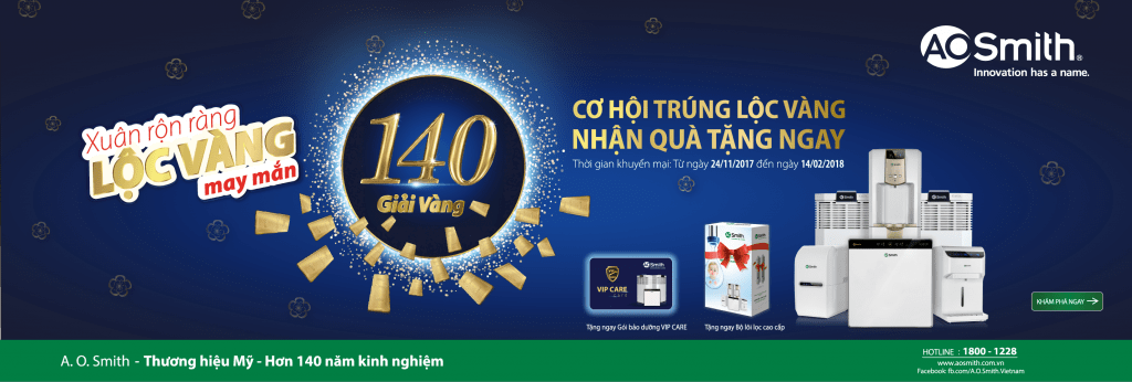 Từ 24/11/2017 đến 14/02/2018, A. O. Smith triển khai chương trình khuyến mại XUÂN RỘN RÀNG, LỘC VÀNG MAY MẮN .