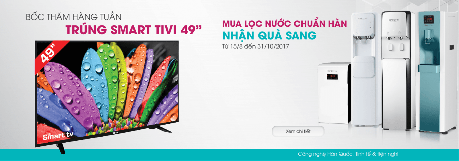 Từ ngày 15/8 đến 31/10/2017, khách hàng mua bất kỳ máy lọc nước Korihome, công nghệ Hàn Quốc tinh tế và tiện nghi, sẽ có ngay cơ hội rinh Smart TV 49 Inch trị giá trên 12 triệu đồng. Cơ hội trúng thưởng mỗi tuần 1 TV cho tất cả khách hàng Korihome, áp dụng trên toàn quốc.