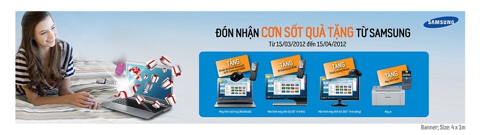 - Các khách hàng khi mua sản phẩm máy tính xách tay Samsung (notebook), sẽ nhận được 1 điện thoại Samsung E1050 trị giá 430.000 vnđ và 1 chuột không dây Microsoft N1000 trị giá 547.000 vnd.