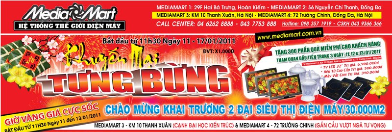 Chương trình khuyến mại “bùng nổ” bắt đầu từ 11h30 ngày 11/1/2011 đến hết 17/1/2011 tại Media Mart 3 – Km 10 Thanh Xuân (cạnh Đại học Kiến trúc) và Media Mart 4 – 72 Trường Chinh (gần Cầu vượt Ngã tư Vọng).