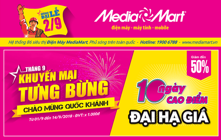 Chào mừng kỷ niệm 73 năm Quốc khánh 2/9, chương trình “10 ngày cao điểm đại hạ giá” diễn ra từ 1/9 đến hết 14/9 được triển khai tại chuỗi siêu thị thuộc Hệ thống thế giới điện máy Media Mart là cơ hội trải nghiệm và mua sắm các sản phẩm điện tử, điện lạnh, laptop, mobile không thể tuyệt vời hơn dành cho khách hàng.